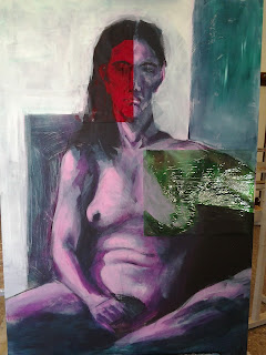 Últimamente tengo un dilema porque siempre hay un momento en la construcción de la obra en la que tengo que decidir: por un lado, con el encaje y la estructura ya planteada, la cabeza me dice que avance según "lo que me dicen desde el exterior"; es decir: trabajo de tonos, luz, sombra y diferentes saturaciones del color. En eso, el ejercicio propuesto de complementarios con blanco y negro me parece muy útil. Pero por otro, y con la libertad que tenemos, se me antoja guiarme por sensaciones, es decir: investigar en la composición de la obra de una manera diferente a la "realista/oficial". Quiero pegar cosas, probar diferentes materiales para, al fin y al cabo, conseguir lo mismo que todos: representar al modelo. La imagen tiene que ser comprensible pero, ¿por qué siempre de la misma manera?